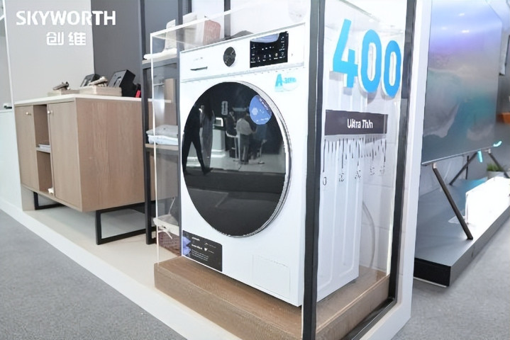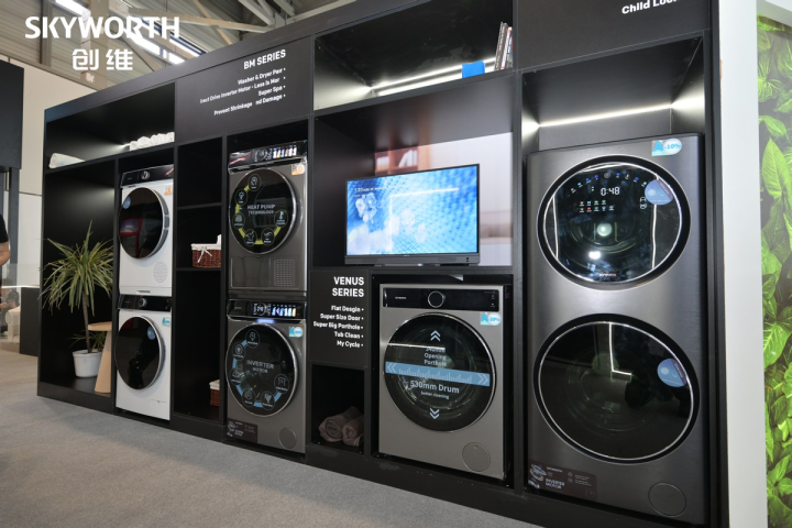 创维滚筒洗衣机产销规模稳居中国前三。展出产品配备彩色触控屏,容量覆盖6至12公斤,提供母婴护理、快洗、轻柔等多种洗涤模式,并具备UV除菌、高温杀菌、筒自洁等智能功能,全面覆盖不同用户需求。其中40cm超薄洗衣机尤其受到欧洲市场欢迎,成为当季热销产品。